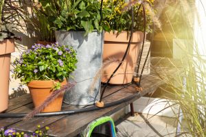 Planten in potten zijn mobiel en dat scheelt. Je kunt ze immers verplaatsen naar een plek in de schaduw. Zo verdrogen ze niet in de felle zon. Kun je ze nergens kwijt of zijn ze te zwaar om naar een beschaduwd plekje te tillen? Zet er een parasol naast. Gaat dat ook niet, dan is een druppelset voor bloempotten een uitkomst. Zo’n druppelset geeft telkens een klein beetje water af. Er komt geen overtollig water onderin de pot te staan, de wortels gaan daardoor niet rotten of schimmelen. Ondertussen hoef jij niet elke dag met een zware gieter naar de kraan heen en weer.