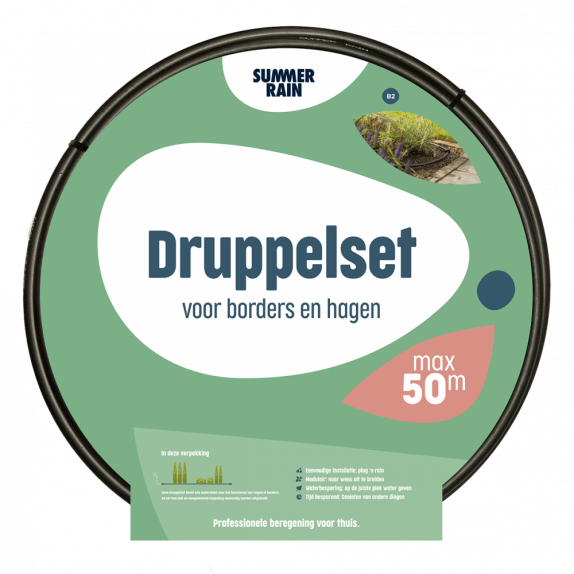 Je border of haag krijgt vanzelf water, terwijl jij alle tijd hebt om zorgeloos van je tuin te genieten. De druppelslang heeft elke 30 cm een druppelaar. Samen geven de druppelaars je planten regelmatig een kleine hoeveelheid water. De gelijkmatige bewatering voorkomt verdamping en verspilling. Zo bespaar je tot wel 70% aan water. De druppelslang is er in twee lengtes: 25 of 50 meter en is eenvoudig in te korten. Leg hem op de grond, dicht bij de wortels van de planten of graaf hem in. O ja, installeren is heel eenvoudig!