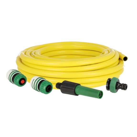 De SummerRain tuinslangset bevat alles om direct te beginnen met het watergeven van je tuin! In deze set zit namelijk een tuinspuit met 2 sproeipatronen, twee koppelstukken (met waterstop, handig omdat er dan geen water onnodig wegloopt) voor het aansluiten van de tuinspuit en op de bijgeleverde kraanaansluiting. De 15 meter lange tuinslang heeft een verstevigde 5 lagen constructie van gerecycled pvc, waardoor de slang niet zal knikken of draaien als de kraan aanstaat! De buitenwand is slijtvast en UV-bestendig wat het een extra lange levensduur geeft. De buitendiameter van deze slang is 17,5mm en de binnendiameter is 12,5mm.