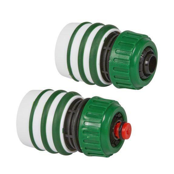 Kraanaansluiting met waterverdeler. Hiermee kun je 2 slangen op 1 kraan aansluiten. De watertoevoer kun je voor beide slangen apart regelen en afsluiten. Geschikt voor kranen met Ø26,5mm (3/4") en Ø 32mm (1") buitendraad.